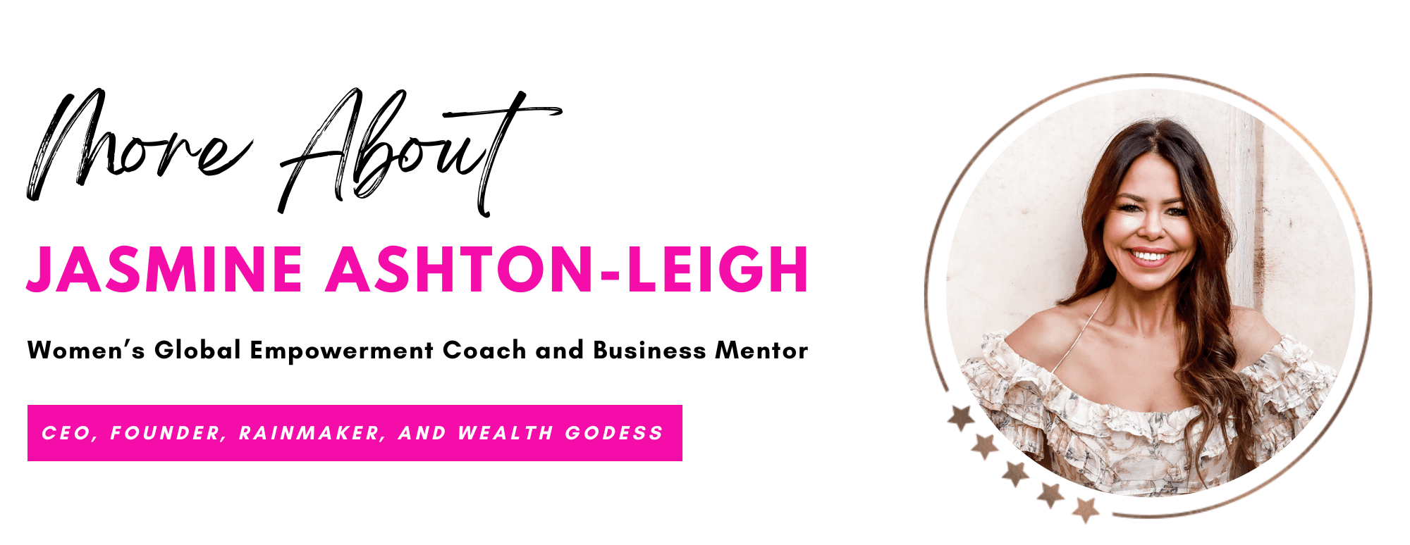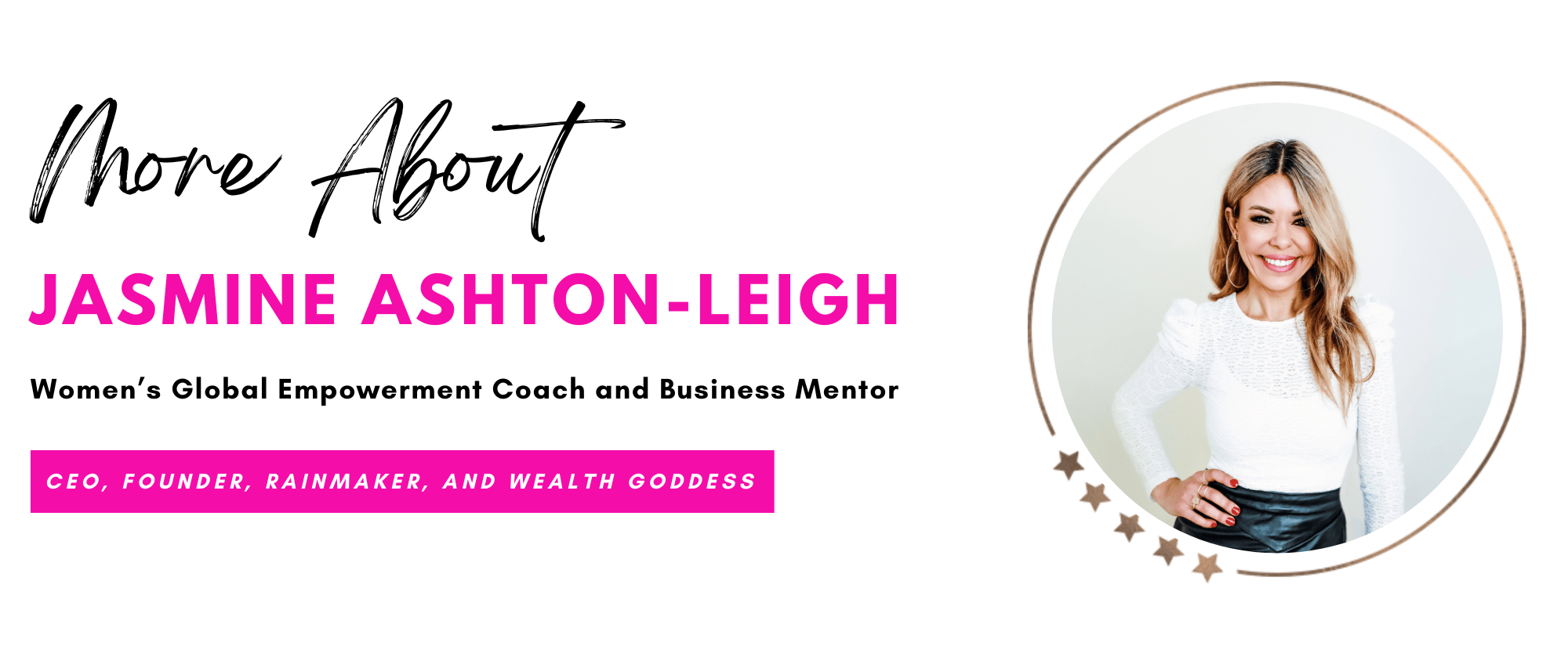 Jasmine Ashton-Leigh, speaker, life coach, and master practitioner of Neuro-Linguistic Programming (NLP), Time Line Therapy®, Neuro Transformation Therapy™ (NTT), and Hypnosis, is a highly qualified expert in her field. Jasmine is the authority in women’s empowerment and business growth. Referred to as an angel, snow plough, rainmaker and the best coach in the world, Jasmine is known for her heart-centered, intuitive, aligned guidance that produces epic growth, transformation and revenue for her clients.